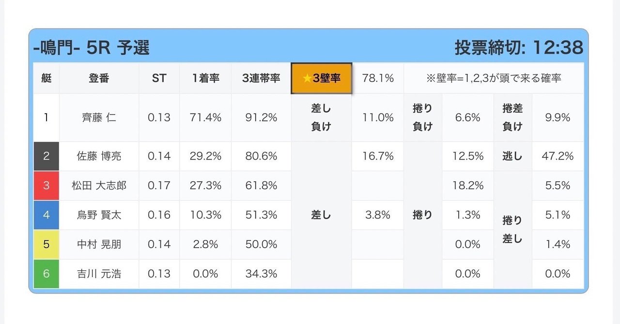 A📕鳴門5R12:38📕 未分類 X Facebook はてブ Pocket LINE コピー 2024.12.03 A📕鳴門5R12:38📕|🚤ミリオン競艇予想🚤日本一のオープンチャット業界初3壁率搭載、3が4の角受けになるかどうかを%で表示、好きなレースを検索出来ます