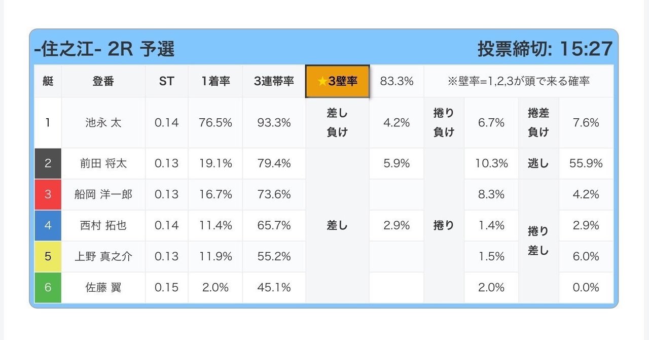 業界初3壁率搭載、3が4の角受けになるかどうかを%で表示、好きなレースを検索出来ます #競艇無料予想 #ボートレース #競艇 #競艇予想 #ボートレース予想 時間がある方はノートのいいね押してもらえたら助かります‼︎