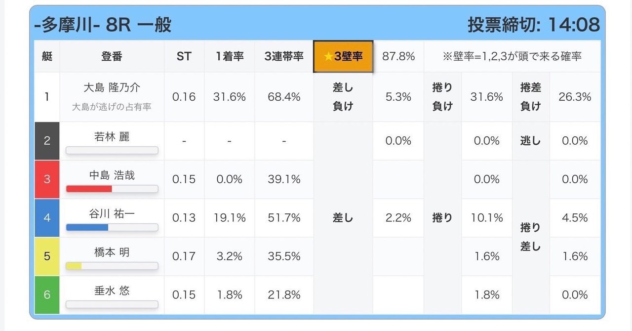 A📕多摩川8R14:08📕 未分類 X Facebook はてブ Pocket LINE コピー 2025.02.01 A📕多摩川8R14:08📕|🚤ミリオン競艇予想🚤日本一のオープンチャット業界初3壁率搭載、3が4の角受けになるかどうかを%で表示、好きなレースを検索出来ます #競艇無料予想 #ボートレース #競艇 #競艇予想 #ボートレース予想 時間がある方はノートのいいねもお願いします。