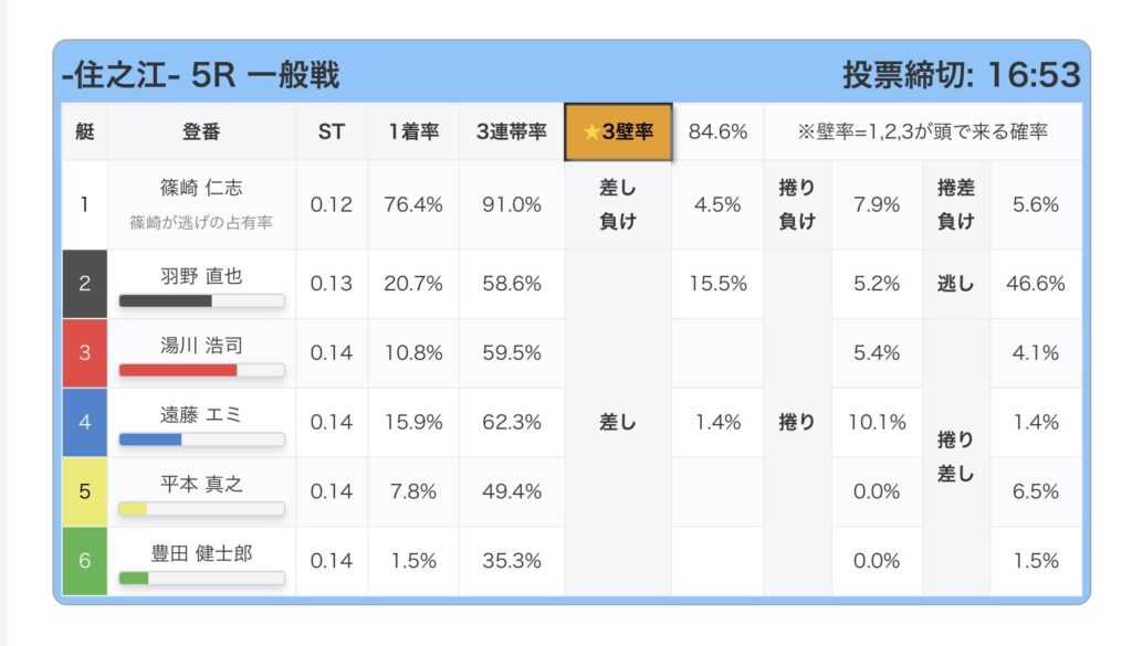 業界初3壁率搭載、3が4の角受けになるかどうかを%で表示、好きなレースを検索出来ます