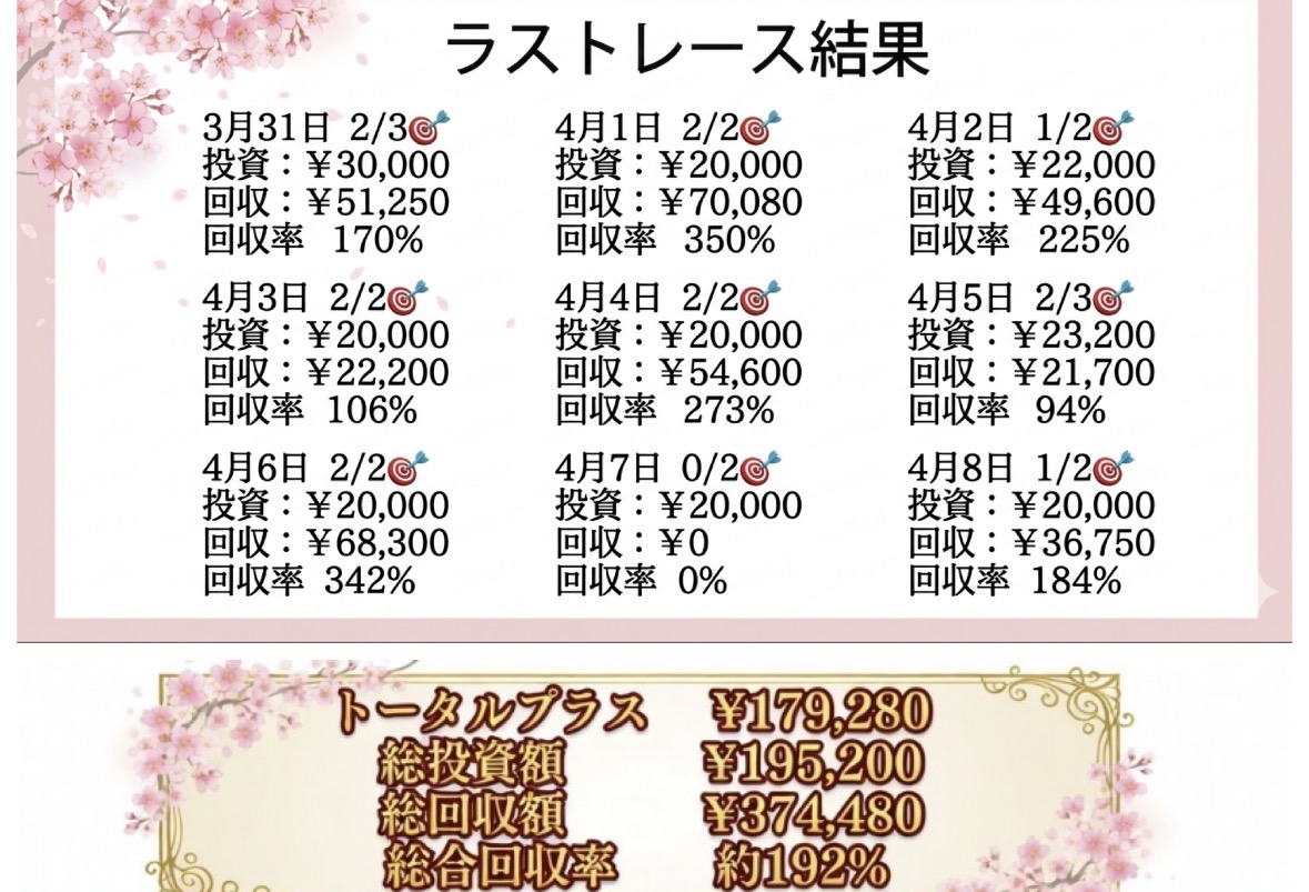 4月9日ナイター最終レースパック20時まで700円、7/9でプラス収支、数量限定