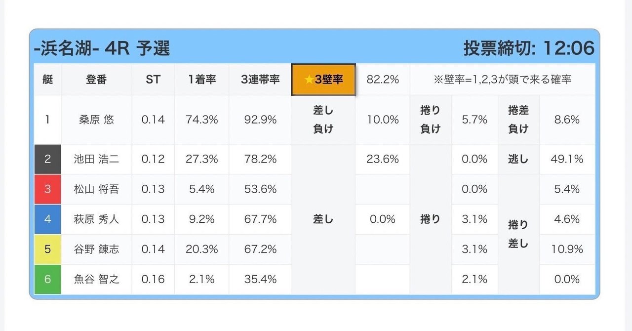 A📕浜名湖4R12:06📕 未分類 X Facebook はてブ Pocket LINE コピー 2024.10.03 A📕浜名湖4R12:06📕|🚤ミリオン競艇予想🚤日本一のオープンチャット業界初3壁率搭載、3が4の角受けになるかどうかを%で表示、好きなレースを検索出来ます