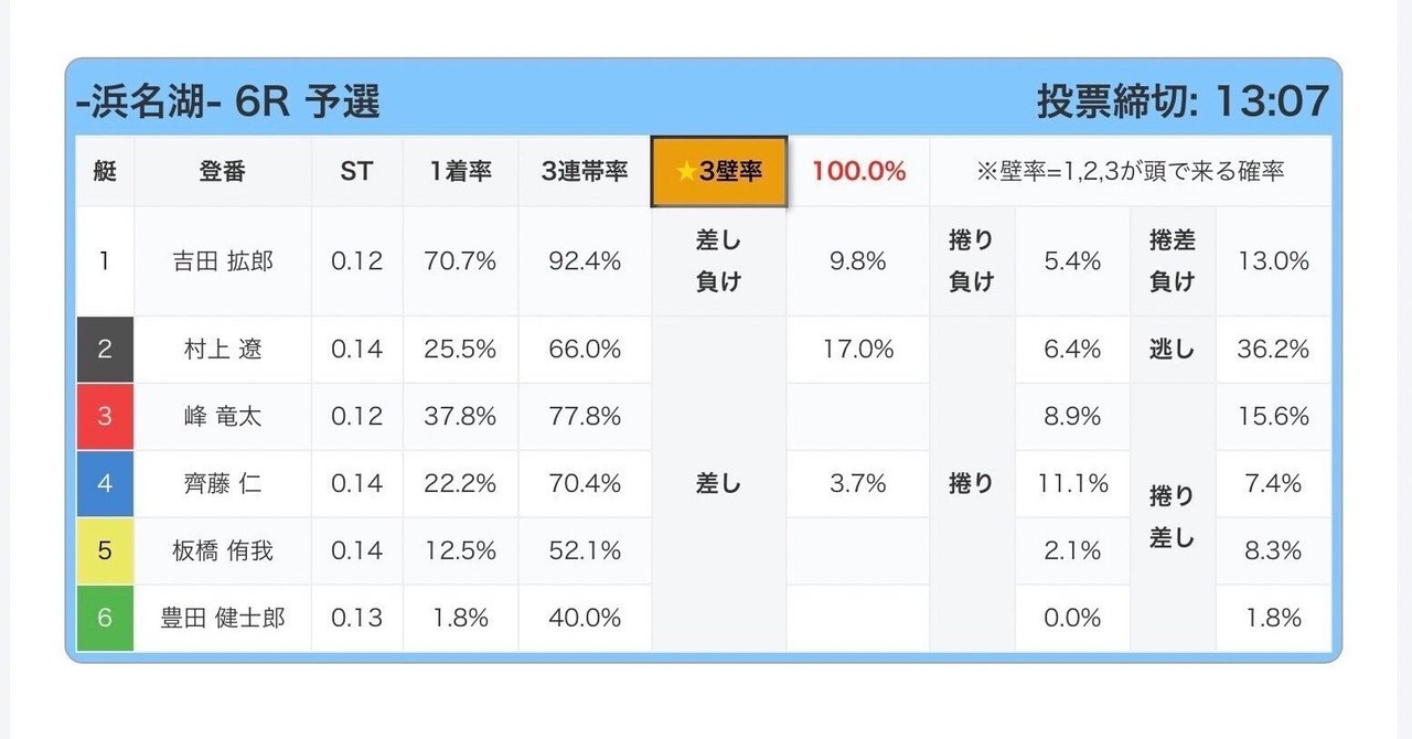 A📕浜名湖6R13:07📕 未分類 X Facebook はてブ Pocket LINE コピー 2024.10.03 A📕浜名湖6R13:07📕|🚤ミリオン競艇予想🚤日本一のオープンチャット業界初3壁率搭載、3が4の角受けになるかどうかを%で表示、好きなレースを検索出来ます